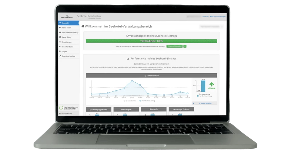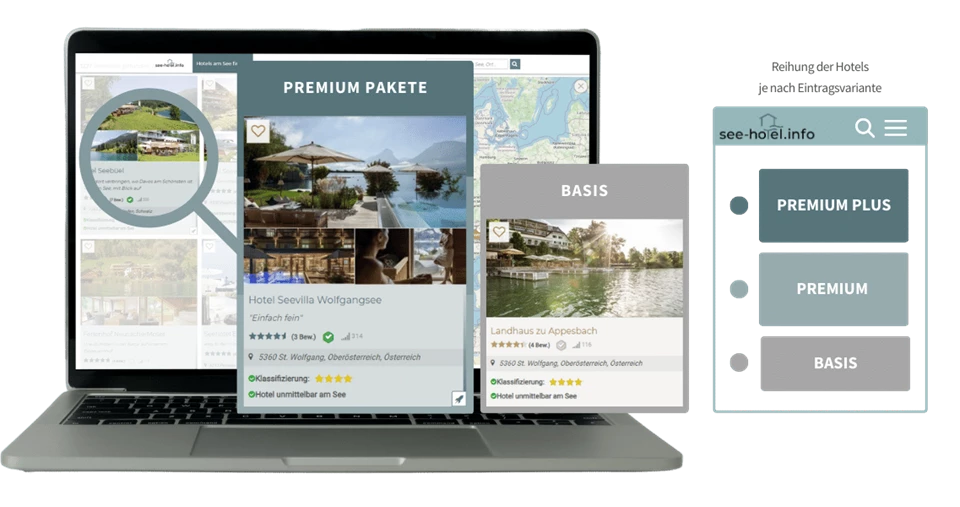 Mit der Aktivierung eines Premium-Paketes steigern Sie Ihre Sichtbarkeit auf see-hotel.info und somit auch die Anzahl der Anfragen und Klicks auf Ihre Website.